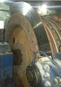 經(jīng)專業(yè)部門到事故現(xiàn)場進行檢測,該提升機配置4 對 TP1-63 制動器頭,輸出正壓力分別為 5、15、15、20 kN;現(xiàn)場檢測制動盤偏擺量達到 3 mm,大大超出規(guī)程要求的 1 mm;液壓站zui高油壓為 3.3 MPa;全制動時液壓系統(tǒng)殘壓達到 1 MPa。