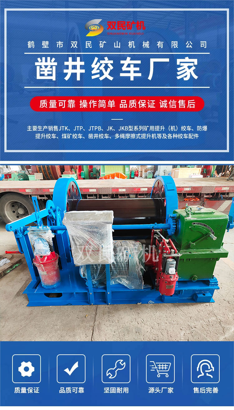 鶴壁市雙民礦山機械有限公司鑿井絞車廠家,以制造大型礦山提升設備,電器成套自動化控制系統為主的科研型高科技企業,是國家礦山專用設備及配件產品定點生產單位。主要生產、銷售JTK、JTP、JTPB、JK、JKB、JKM、JKMD型系列礦用提升絞車、礦井提升機、多繩摩擦式提升機、JZ型鑿井絞車及礦山各種成套設備及配件。